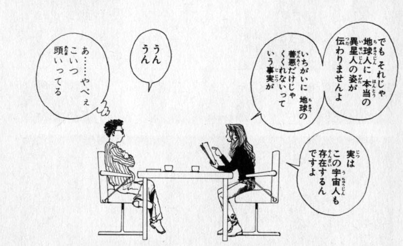 A un certo punto della storia, infatti, Yamamoto (con i suoi familiari) si rivela essere un alieno del pianeta Conwell appartenente a una specie che si riproduce tramite la fagocitazione del partner femminile; questa azione è invogliata biologicamente da un fortissimo senso di fame che viene a placarsi solo dopo che la carne della partner viene assimilata18. Yamamoto e gli altri componenti della sua famiglia sono gli ultimi conwelliani rimasti e si trovano nella terribile situazione di continuare a provare fame per coloro verso le quali provano attrazione sessuale, senza però potersi riprodurre. Come viene specificato, infatti, l’assimilazione di carne non conwelliana non ha alcuna funzione nella loro riproduzione. La cosa interessante da tenere a mente è proprio il fatto che i conwelliani continuano a provare questo tremendo senso di fame finché non si nutrono della partner e che questo sentimento non è placabile in altro modo (questo fenomeno xeno-biologico nella storia è chiamato stomaco invisibile); in un certo senso i conwelliani si “trovano costretti” a nutrirsi di carne umana, seppur sia completamente inutile a fini riproduttivi.